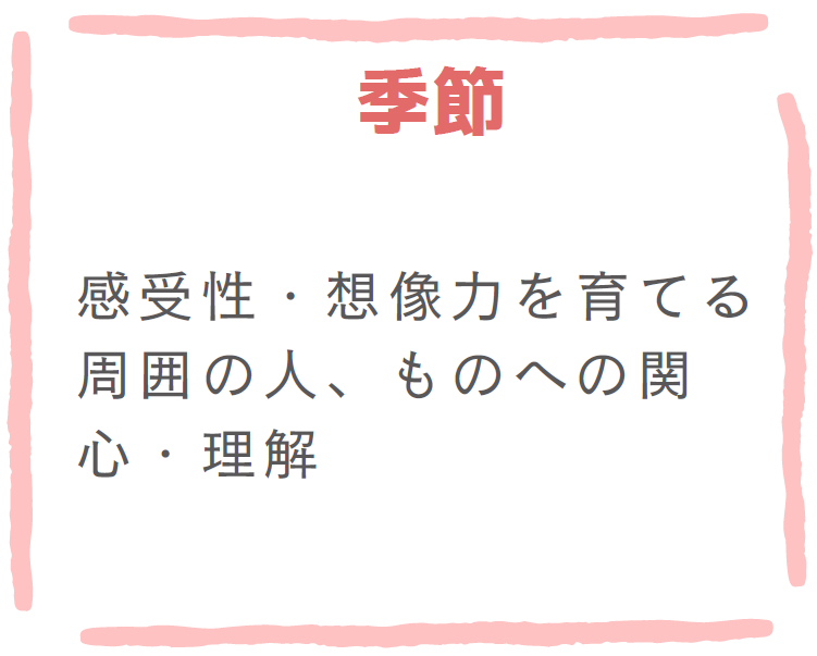 季節の変化を感じることで、自然や環境への興味が深まり、感性が豊かになります。また、時間の流れを意識することで、物事の移り変わりを理解する力が養われます。季節ごとの行事を体験することで、日本の伝統や文化に触れる機会となり、自分の生活とつながりのある学びができます。